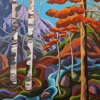 “As an artist I seek to go beyond realism. I draw largely on imagination and memory and let the Canadian landscape unfold on my canvas with both real and imagined elements. My joy and challenge as an artist lies in striking a harmonious balance between realism and abstraction. My expressionist work in acrylic is highly stylized and features bold colour,flowing line and whimsical compositions. With each painting, I seek to express a moment in nature that speaks deeply to the viewer -- a meditative place that resides between energy and movement, stillness and quiet. I am drawn to these ever present elements in the landscape."